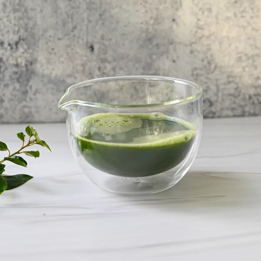 - Double Sided Spouted Glass Matcha Bowl. This Clear Glass Matcha Bowl works great for Matcha and any other types of teas, especially green teas and flower teas. The clear bowl with a spout allows you to perfect a matcha experience without any messes. This matcha bowl measures 4.75 inches in diameter and 3.55 inches tall. Serves 16 oz.